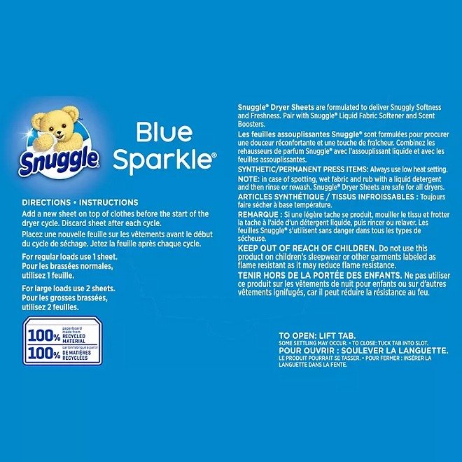 Snuggle’s original Blue Sparkle scent is a fresh and clean blend of white floral and bright green citrus notes that snuggle up to warm woody notes and soft musk for a comforting, long-lasting freshness your family will love. In addition to using in the dryer to make your clothes feel softer, dryer sheets can also be used in a variety of places like closets, gym bags, suitcases, and cars to make them smell fresh. For long-lasting freshness and static reduction, add a Snuggle dryer sheet to every load you dry.