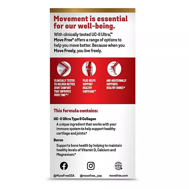 Move Free Ultra Triple Action supports your joints, cartilage and bones in just one tiny pill so you can stay moving and keep up with your daily activities with key ingredients. Ingredients include: Type II Collagen, a protein found in healthy cartilage, hyaluronic acid (HA)† and boron.