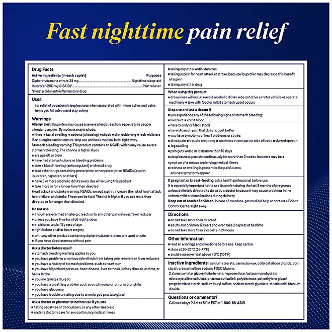 • Ingredients: Active: (in each caplet) Diphenhydramine Citrate 38mg - Nighttime Sleep-Aid. Ibuprofen 200mg (NSAID)* - Pain Reliever. *nonsteroidal anti-inflammatory drug. Inactive: Calcium Stearate, Carnauba Wax, Colloidal Silicon Dioxide, Corn Starch, Croscarmellose Sodium, FD&C Blue No. 2 Aluminum Lake, Glyceryl Behenate, Hypromellose, Lactose Monohydrate, Microcrystalline Cellulose, Pharmaceutical Ink, Polydextrose, Polyethylene Glycol, Pregelatinized Starch, Sodium Lauryl Sulfate, Sodium Starch Glycolate, Stearic Acid, Titanium Dioxide