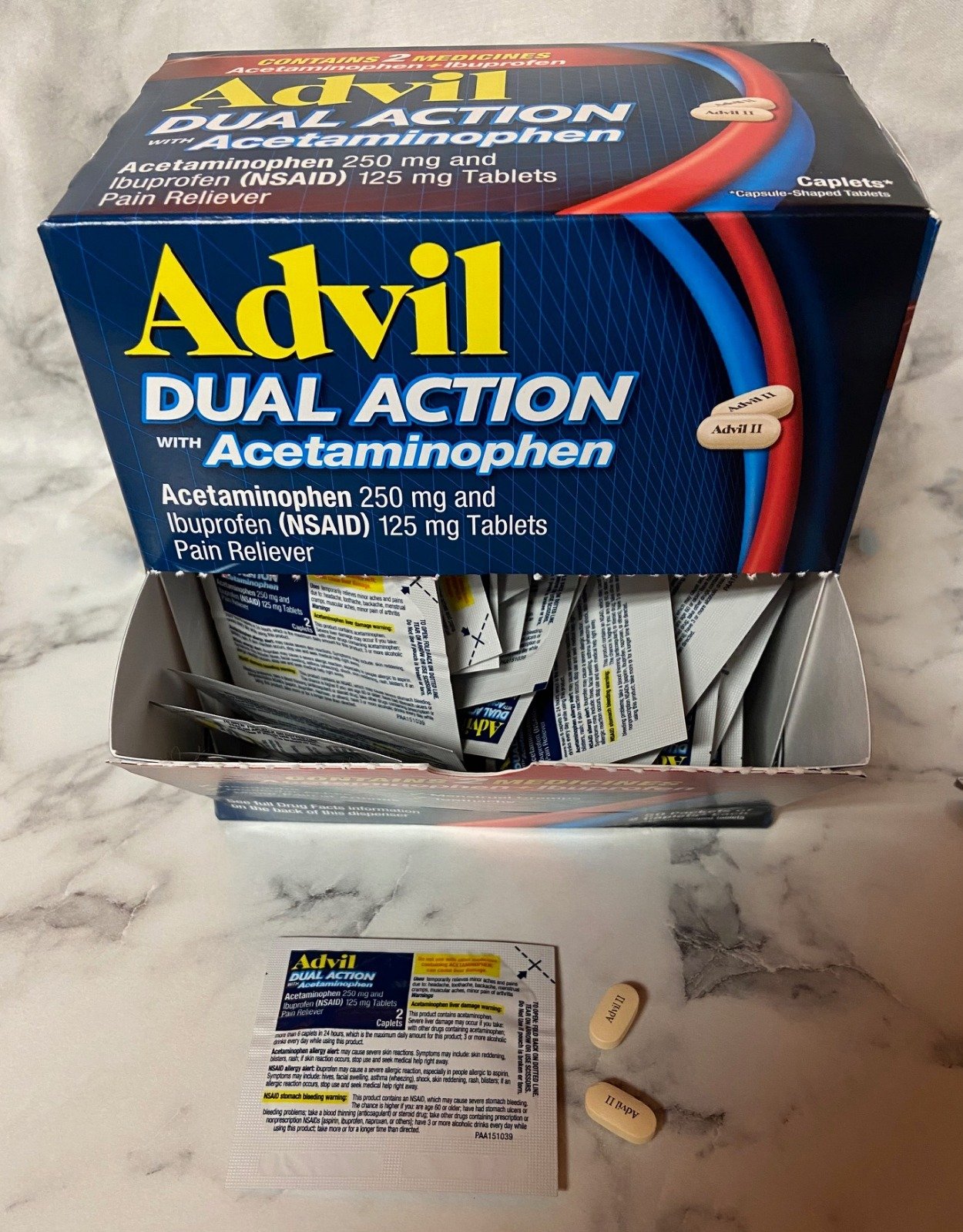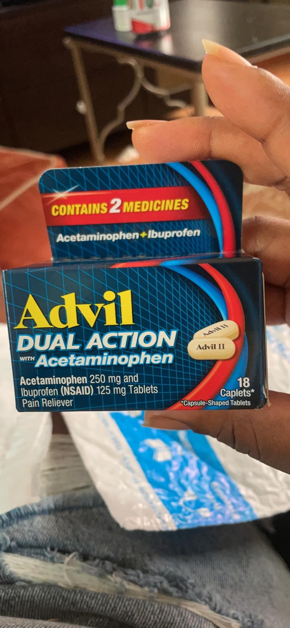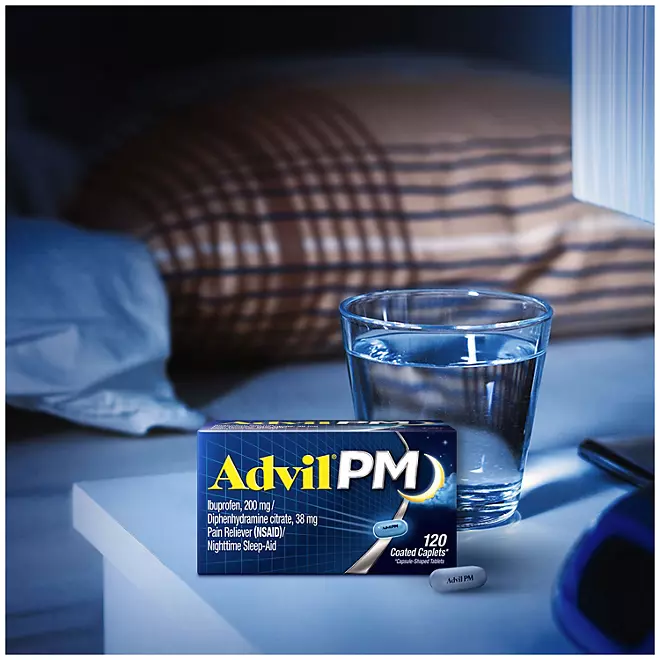 • One bottle of 200 coated caplets of Advil PM Pain Reliever and Nighttime Sleep Aid, Ibuprofen for Pain Relief and Diphenhydramine Citrate for a Sleep Aid