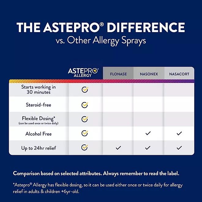 This steroid-free allergy spray provides long-lasting allergy relief of indoor and outdoor nasal allergy symptoms; nasal congestion, runny nose, sneezing, and itchy nose for up to 24 hours. Now Astepro allergy is available at its full prescription strength. Astepro allergy has flexible dosing, so it can be used either once or twice daily for allergy relief.