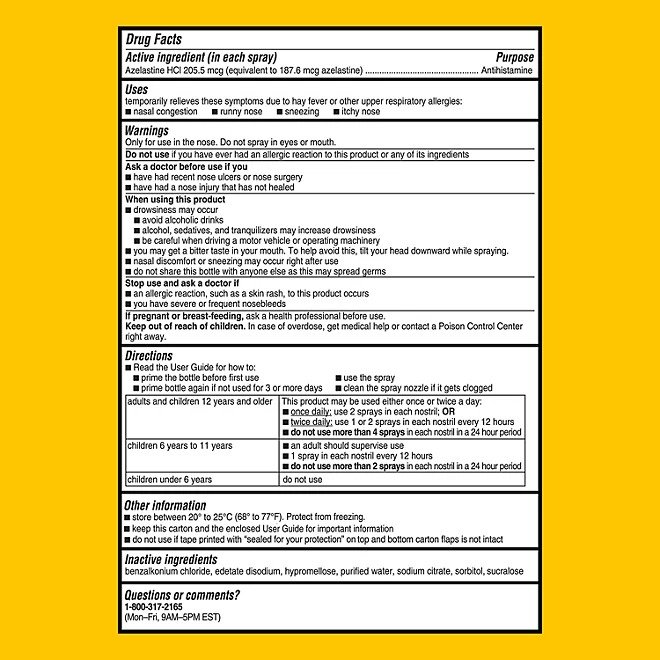 This nasal spray is steroid-free, alcohol-free and fragrance-free. One spray contains 205.5 mcg of azelastine HCl. This pack contains Astepro Allergy antihistamine nasal spray, powerful and effective steroid-free allergy relief.