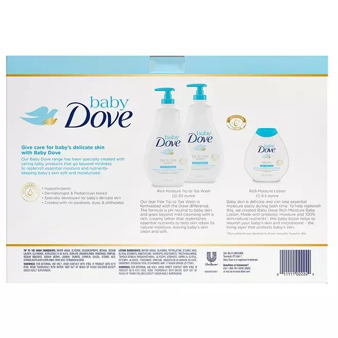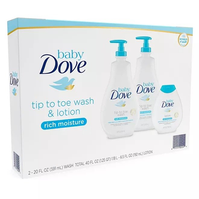 Ophthalmologist-, dermatologist-, and pediatrician-tested with a tear-free and hypoallergenic formula, this bath wash and shampoo is just the thing to make your baby’s bath time special. The rich, creamy lather creates plenty of bubbles, while helping leave your baby’s delicate skin clean, moisturized, and soft, more effectively than ordinary baby soap. This Tip to Toe Wash and Shampoo 2 x 20 oz pack is sold with and additional 6.5-oz. Baby Dove Sensitive Moisture Baby Lotion. Look for the fragrance-free Baby Dove Sensitive Moisture Tip to Toe Wash and Shampoo. The best baby lotion for babies should give the gentle, nourishing care their delicate developing skin needs.