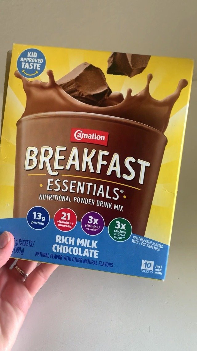 Carnation Breakfast Essentials Rich Milk Chocolate Nutritional Drink mix is a powdered mix that makes a delicious breakfast drink the whole family will love—just mix with 1 cup of skim milk. Start your day right with this chocolate drink mix with 13 grams of protein and 220 calories per prepared serving. Carnation Breakfast Essentials Rich Milk Chocolate powder drink mix is an easy way for families to get the vitamins and minerals they need to kick off their day; each serving of this breakfast drink powder has 21 vitamins and minerals, twice the amount of Vitamin D as an eight-ounce glass of milk and twice as much calcium as a six ounce cup of yogurt. These powdered nutritional drink mixes aren’t just great as a breakfast drink, they also make great snacks and mini meals. The pack includes 30 sealed 1.26 ounce drink mix packets. Carnation Breakfast Essentials nutritional shakes make it easy to start your day with good nutrition. For ages 4 years and older. Each morning represents a fresh start that is full of potential, and when you start right, there’s no telling where the day will take you. Carnation Breakfast Essentials products have been part of family mornings for over 50 years.