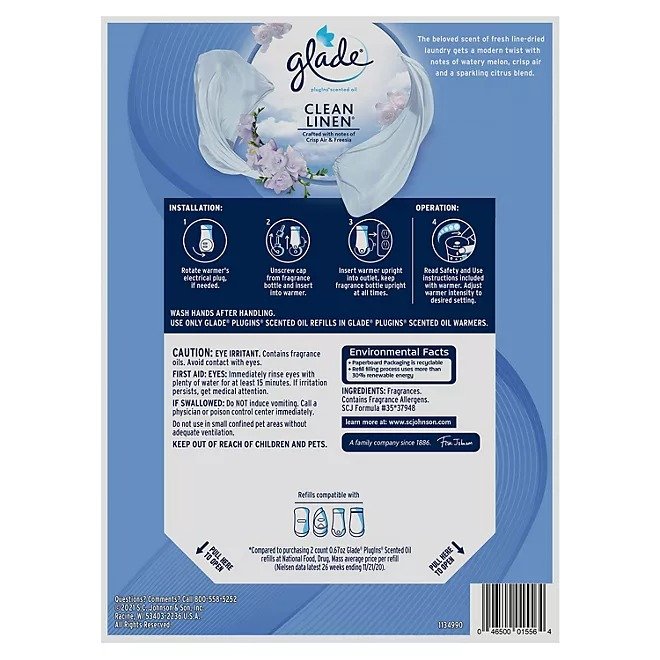 Enjoy the long-lasting scent of Glade Clean Linen PlugIns Scented Oil. When used on a low setting, this air freshener can keep your home smelling fresh for up to 50 days. All you need to do is fill the scented oil warmer with a refill, plug it in, and let the fragrance fill your room. It’s a simple and effective way to keep your home smelling great, day after day.