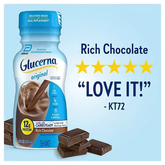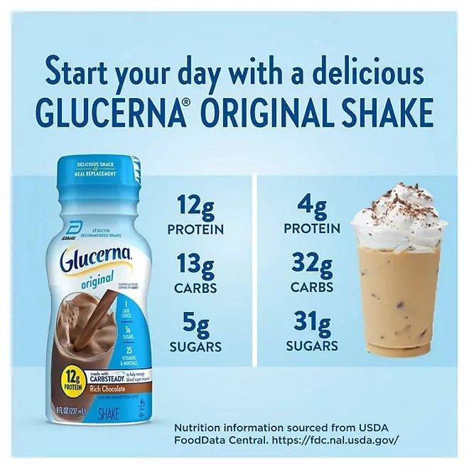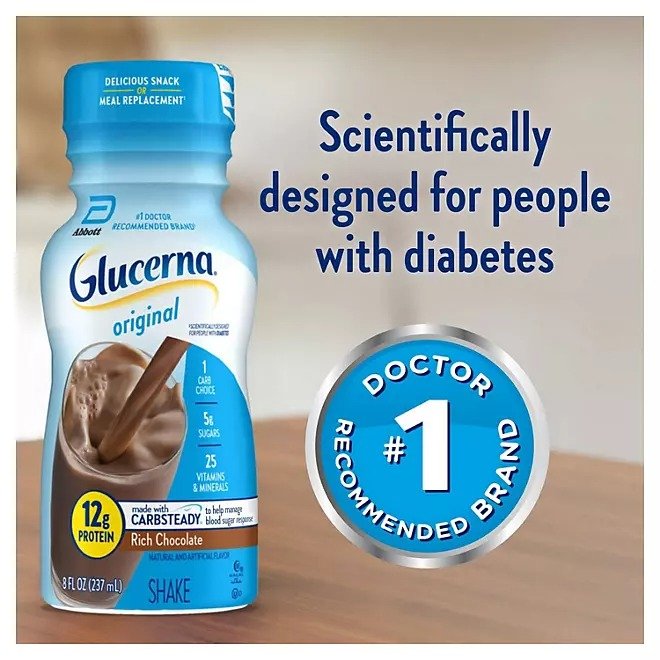 Glucerna shakes are delicious grab-and-go small meal or snack replacements designed for people managing their blood sugar. Glucerna shakes have Carbsteady, unique blends of slow-release carbohydrates to help manage blood sugar,* as well as 12 grams of protein, 140 calories, and essential vitamins & minerals. They are suitable for lactose intolerance (not for people with galactosemia) and are gluten-free. Glucerna is the # brand recommended by doctors for people with diabetes.