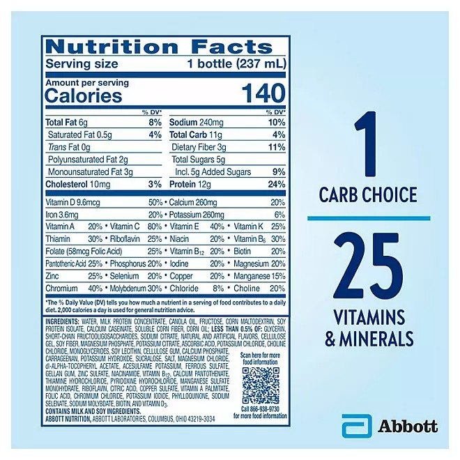 Water, milk protein concentrate, canola oil, fructose, corn maltodextrin, soy protein isolate, calcium caseinate, soluble corn fiber, corn oil; Less than 0.5%: glycerin, short-chain fructooligosaccharides, sodium citrate, natural and artificial flavors, cellulose gel, soy fiber, magnesium phosphate, potassium citrate, ascorbic acid, potassium chloride, choline chloride, monoglycerides, soy lecithin, cellulose gum, calcium phosphate, carrageenan, potassium hydroxide, sucralose, salt, magnesium chloride, DL-alpha-tocopheryl acetate, acesulfame potassium, ferrous sulfate, gellan gum, zinc sulfate, niacinamide, vitamin b12, calcium pantothenate, thiamine hydrochloride, pyridoxine hydrochloride, manganese sulfate monohydrate, riboflavin, citric acid, copper sulfate, vitamin A palmitate, folic acid, chromium chloride, potassium iodide, phylloquinone, sodium selenate, sodium molybdate, biotin, and vitamin D3. Contains Milk and soy ingredients.