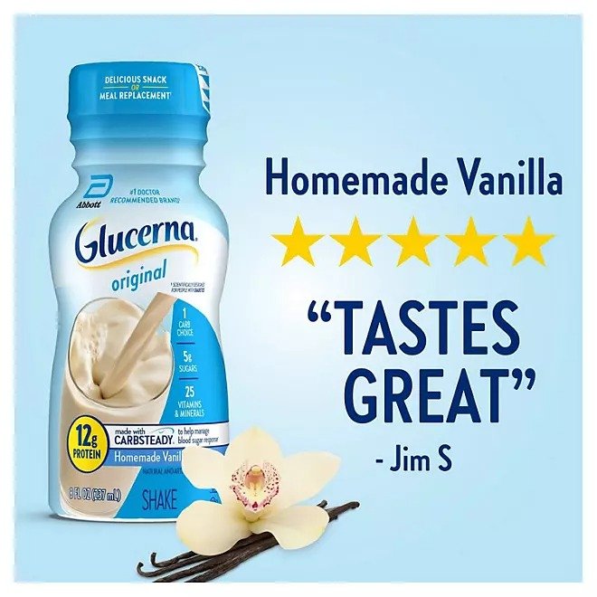 Glucerna shakes are delicious grab-and-go small meal or snack replacements designed for people managing their blood sugar. Glucerna shakes have Carbsteady, unique blends of slow-release carbohydrates to help manage blood sugar,* as well as 12 grams of protein, 140 calories, and essential vitamins & minerals. They are suitable for lactose intolerance (not for people with galactosemia) and are gluten-free. Glucerna is the # brand recommended by doctors for people with diabetes.