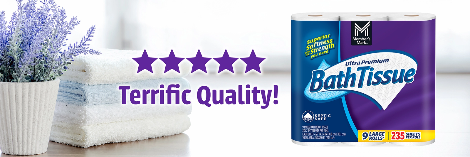 Get a comfortable, confident clean with Member’s Mark Ultra Premium Bath Tissue, 2-Ply Large Roll (235 sheets, 45 rolls). Member’s Mark bath tissue is soft, strong and incredibly absorbent, with more sheets per roll than other leading brands.