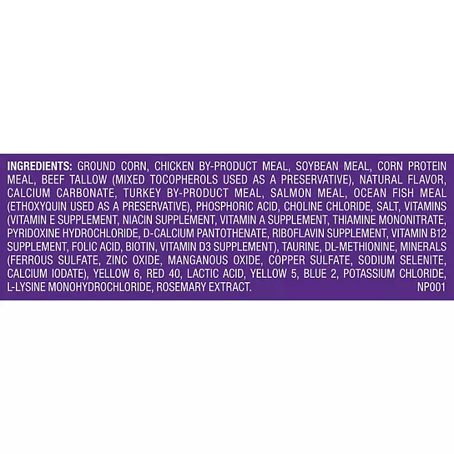 Ingredients List:Â Whole Ground Corn, Soybean Meal, Chicken By-product Meal, Corn Gluten Meal, Beef Tallow (preserved With Mixed Tocopherols), Animal Digest, Calcium Carbonate, Turkey By-product Meal, Salmon Meal, Ocean Fish Meal, Phosphoric Acid, L-lysine Monohydrochloride, Choline Chloride, Salt, Titanium Dioxide (color), Vitamins (vitamin E Supplement, Niacin, Vitamin A Supplement, Thiamine Mononitrate, Riboflavin Supplement, D-calcium Pantothenate, Pyridoxine Hydrochloride, Vitamin B12 Supplement, Menadione Sodium Bisulfite Complex (source Of Vitamin K Activity), Vitamin D3 Supplement, Folic Acid, Biotin), Taurine, Minerals (ferrous Sulfate, Zinc Oxide, Manganous Oxide, Copper Sulfate, Calcium Iodate, Sodium Selenite), Dl-methionine, Yellow 6, Red 40, Lactic Acid, Yellow 5, Blue 2, Potassium Chloride, Rosemary Extract