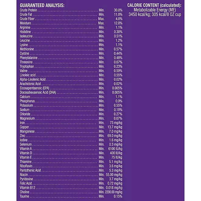 Nutritional Analysis: Crude Protein(Min)...30.0%, Crude Fat(Min)…11.0%, Crude Fiber(Max)…4.0%, Moisture(Max)…12.0%, Calcium(Min)...1.1%, Phosphorus(Min)...0.9%, Selenium(Min)...0.3mg/kg, Vitamin D(Min)...400IU/kg, Vitamin E(Min)...75IU/kg, Taurine(Min)...0.15%,