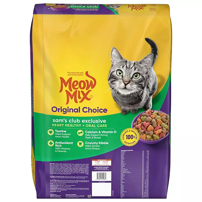 Meow Mix Original Choice Sam’s Exclusive Mix is a unique dry cat food formulated to help support your cat’s heart health and oral care. The mix includes new red heart and green leaf kibble made with the delicious flavors of chicken, turkey, salmon and ocean fish for an irresistible taste cats ask for by name. This flavor is the perfect way to connect with your cat over a healthy, delicious meal—only from Sam’s Club!