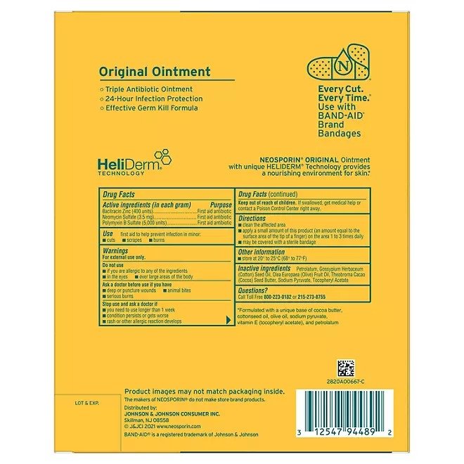 Neosporin Original First Aid Antibiotic Ointment provides long-lasting infection protection and minimizes the appearance of scars. Made with bacitracin zinc, this first aid antibiotic ointment helps prevent infection in minor cuts, scrapes, and burns and helps minimize the appearance of scars. Pair your Neosporin with Band-Aid to be fully wound-care prepared.