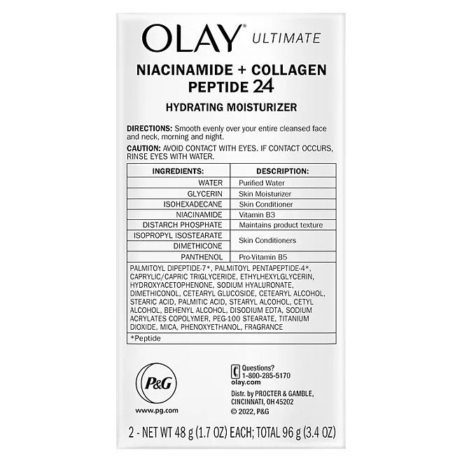 Olay Ultimate Niacinamide + Collagen Peptide24 Face Moisturizer is supercharged for instant visible wrinkle and firming results. It strengthens skin barrier, evens complexion, and visibly corrects wrinkles. It’s crafted by our top scientists with our clinically proven technology, with 99% pure Niacinamide, to improve skin’s moisture barrier for 2x stronger skin*.