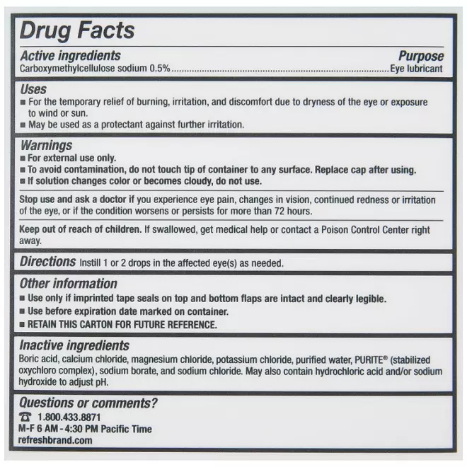 • Ingredients: Active Ingredients: Carboxymethylcellulose sodium 0.5% Eye lubricant. Inactive Ingredients: Boric acid; calcium chloride; magnesium chloride; potassium chloride; purified water; PURITE® (stabilized oxychloro complex); sodium borate; and sodium chloride. May also contain hydrochloric acid and/or sodium hydroxide to adjust pH.